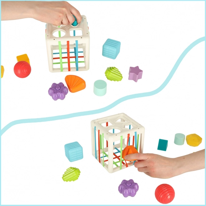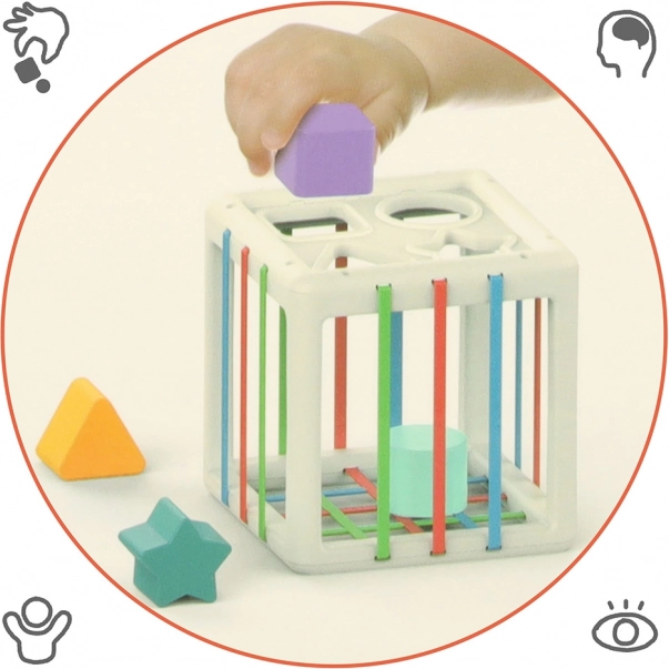 Kontakt z elastycznymi elementami wspomaga rozwój zdolności manualnych, siły i koordynacji rąk i oczu. Bezpieczne materiały zapewniają, że kostka jest odpowiednia nawet dla najmłodszych.