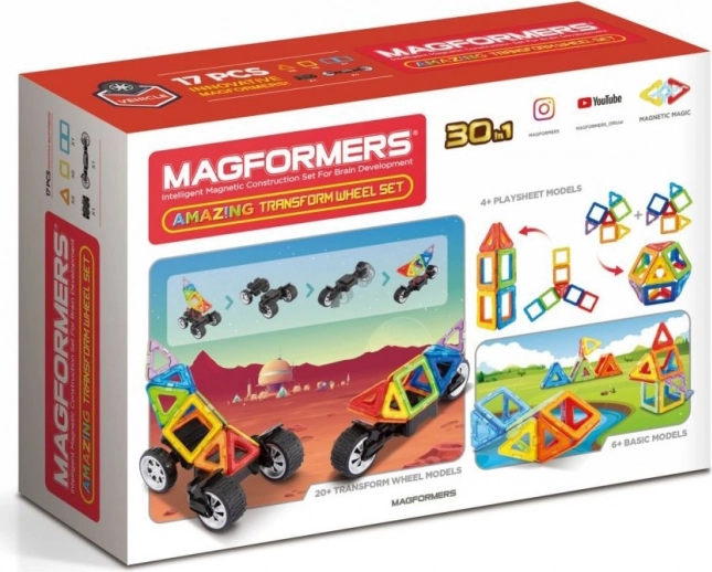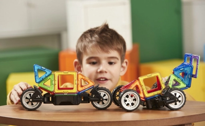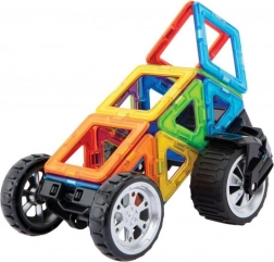 Jedno ze specjalnych podwozi wyposażono w masywne koła, które można niezależnie od siebie obracać aż o 90°, dzięki czemu nadają się do modelowania pojazdów jedno- i dwusladowych. Drugie podwozie to klasyczna oś z 2 połączonymi kołami, przy której można ustawić 3 różne wysokości płyty łączącej, co przydaje się do odważnych karoserii quadów i buggy. W połączeniu z dowolnymi innymi elementami Magformers różnorodność i rozmiar pojazdów wielokrotnie rosną. Większość z setek zbudowanych z tego zestawu aut i motocykli jest zaskakująco wytrzymała, więc można je śmiało wykorzystywać jako działające zabawki. Odpowiednie dla dzieci od 3 lat.