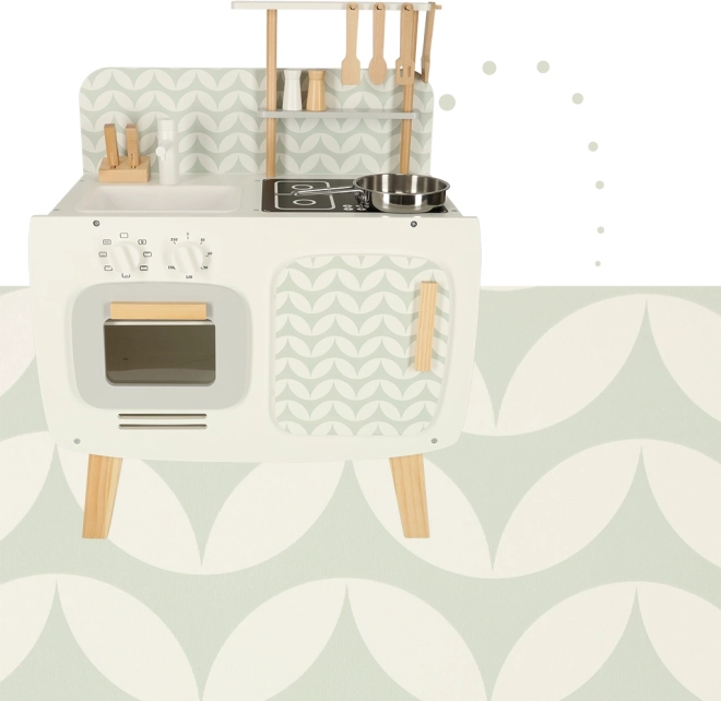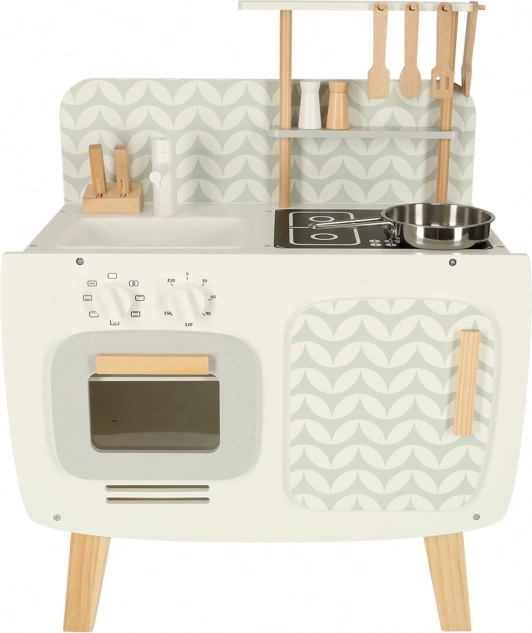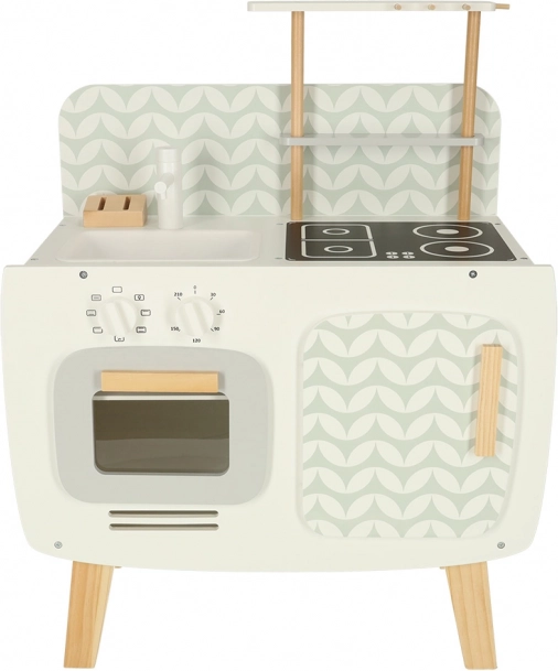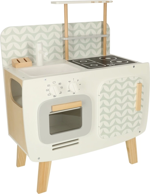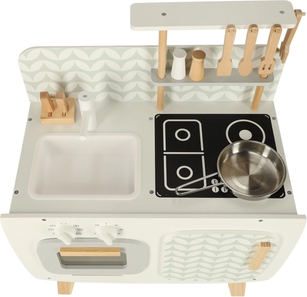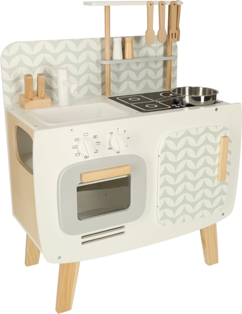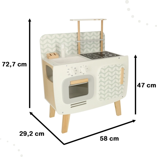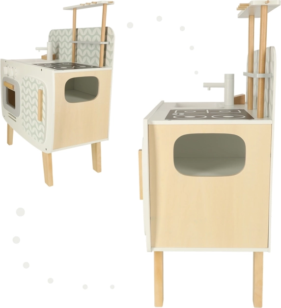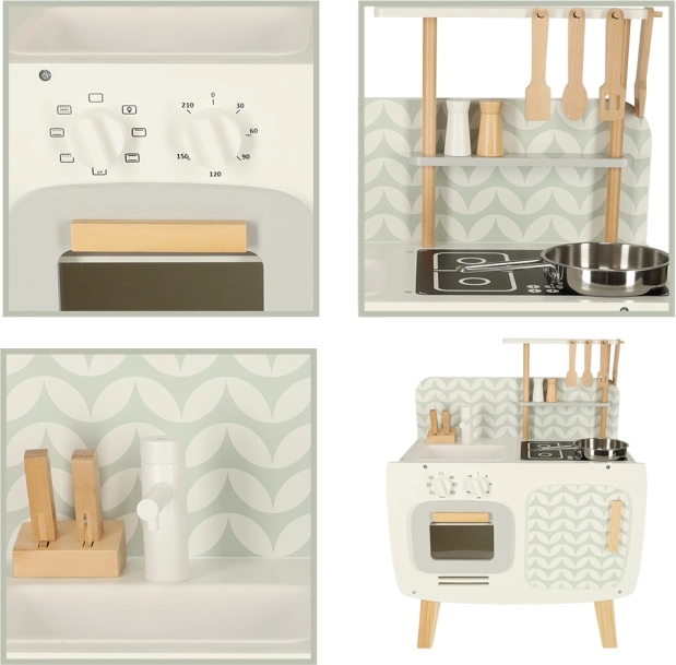 Kuchnia jest wyposażona w podstawowe urządzenia, takie jak piekarnik, kuchenka i zlew. Ruchome elementy, takie jak obracane pokrętła, dodają wiarygodności zabawie, zwiększając zaangażowanie i zainteresowanie dzieci działalnością kulinarną.