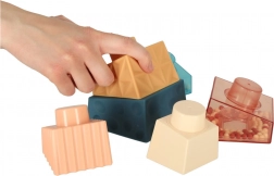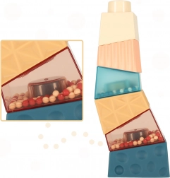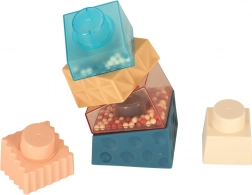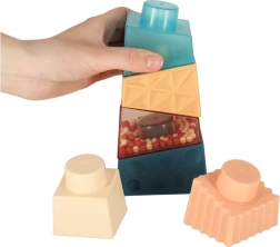 Kolorowe i teksturowane klocki, w tym te z kulkami, stymulują wzrok i dotyk dziecka.