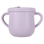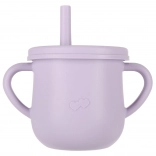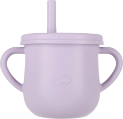 Kubek treningowy z dwoma uszkami, dwoma wieczkami i słomką pomaga dzieciom uczyć się samodzielnego picia; wewnętrzne podziałki ułatwiają dozowanie.