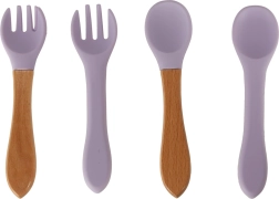 • Przyjemne materiały: miękki silikon + drewniane rączki sztućców