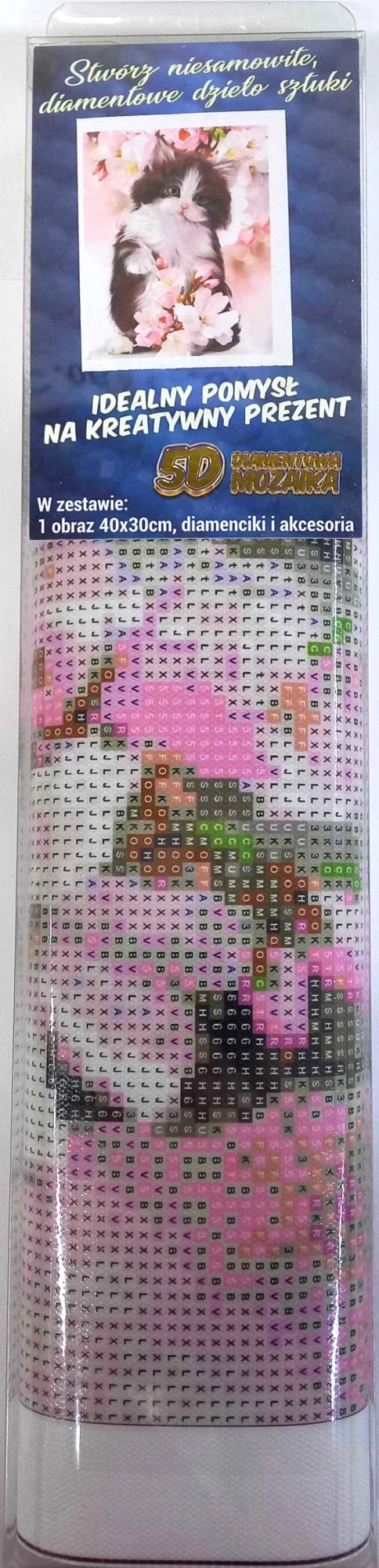 Zawartość opakowania: płótno z nadrukowanym obrazem, długopis do aplikacji kamyczków, tacka do wysypywania kamyczków, wosk do przyklejania, zestaw kolorowych kamyczków.