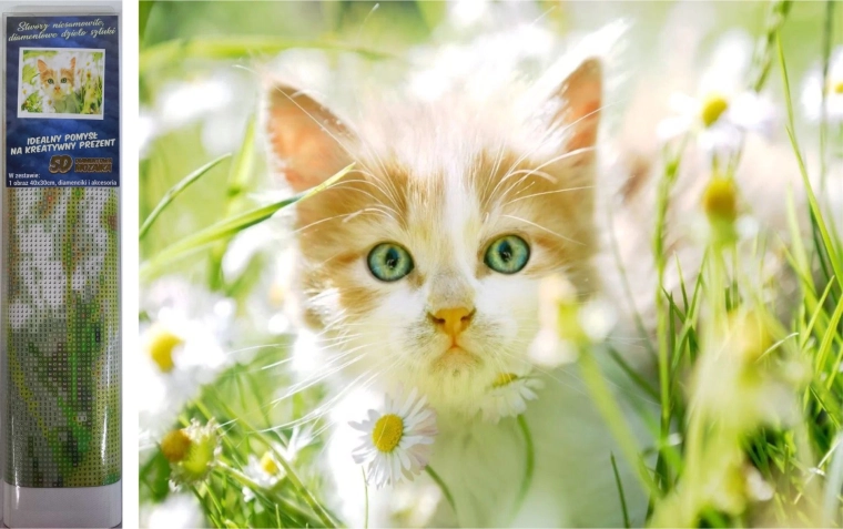 Malowanie diamentowe to świetny sposób na oczyszczenie głowy i twórcze spędzenie czasu. Motyw kocięcia wśród stokrotek rozjaśni każde wnętrze, a gotowy obraz można łatwo oprawić (rama nie jest częścią zestawu). Nie musisz mieć żadnych umiejętności plastycznych – wystarczy podążać za nadrukowanymi symbolami na płótnie.