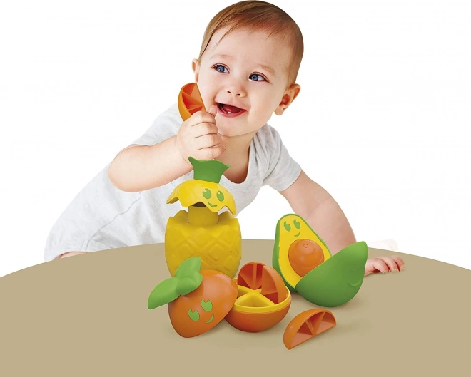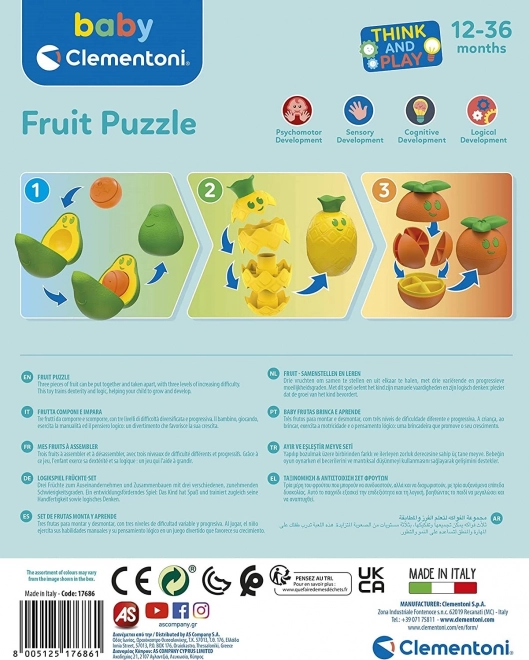 Odkryj mądrą i zrównoważoną zabawę z CLEMENTONI BABY. Zestaw Układane owoce oferuje trzy urocze owoce – awokado, ananas i pomarańczę – które zachęcają dzieci do odkrywania, sortowania i układania. Każdy element został zaprojektowany tak, aby wspierać rozwój myślenia logicznego, koordynacji wzrokowo-ruchowej oraz percepcji dotykowej.