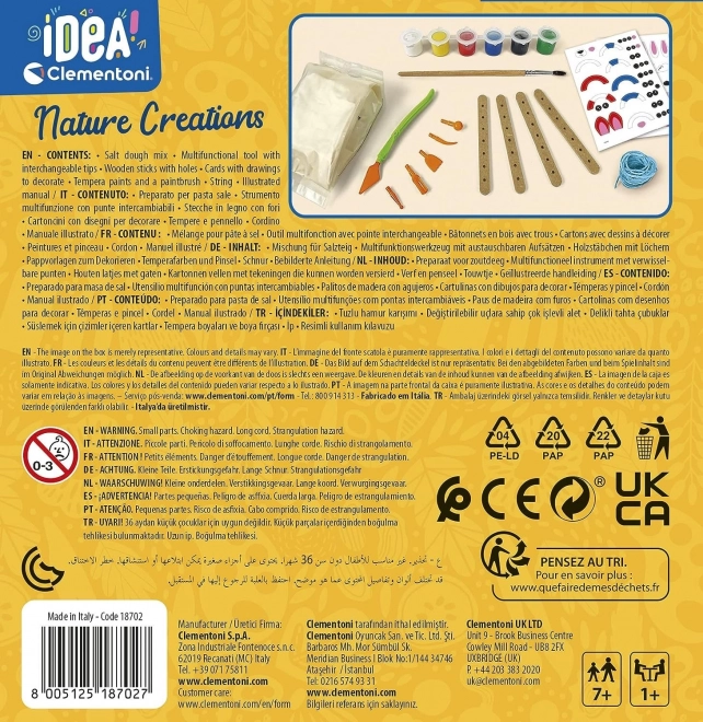 Ten kreatywny zestaw CLEMENTONI IDEA Natura zawiera wszystko, czego dzieci potrzebują do tworzenia pięknych dekoracji z ciasta solnego. Modeluj, wykrawaj, skręcaj, maluj i ozdabiaj – wyobraźnia nie zna granic. Gotowe prace mogą ozdobić dziecięcy pokój lub posłużyć jako miłe prezenty.
