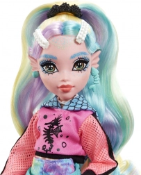 Lalka Cleo De Nile z kolekcji Monster High zachwyca ikonicznym strojem inspirowanym starożytnym Egiptem: niebiesko‑złotą sukienką z rękawami przypominającymi bandaże, uzupełnioną łańcuszkowym paskiem i wysokimi butami pod kolano. Całość dopełniają złota biżuteria i stylowe okulary przeciwsłoneczne.