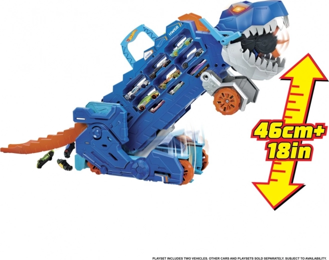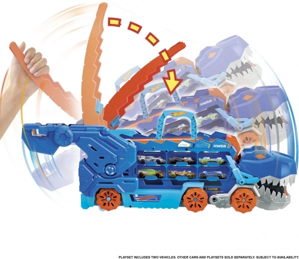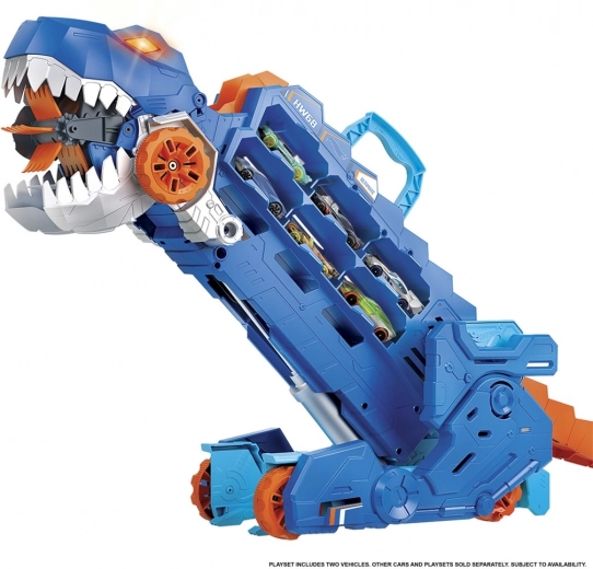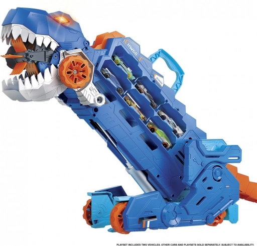 Praktyczne boczne przegródki i sprytne rozwiązanie załadunku pozwalają szybko „nakarmić” T-Rexa i mieć kolekcję HOT WHEELS zawsze pod ręką, także w podróży.