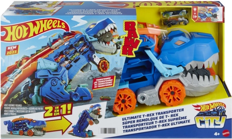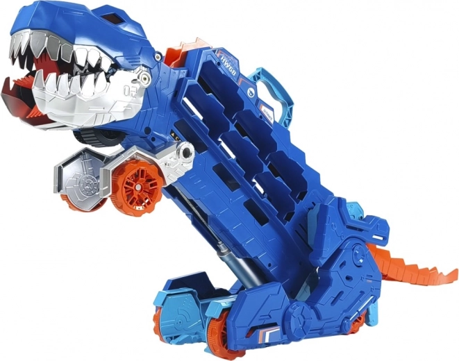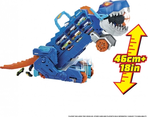 Unikalny transporter dinozaura łączy magazyn na ponad 20 metalowych autek z dynamiczną zabawą. W trybie transportera wystarczy pociągnąć za uchwyt i obserwować, jak T‑Rex „pożera” autka po drodze. Jednym ruchem ogona przemienisz go w mechanicznego T‑Rexa z efektami świetlnymi i dźwiękami dinozaurów.