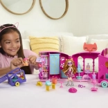 Ten różowo‑fioletowy ruchomy butik z uroczymi kocimi uszkami po otwarciu zamienia się w stylowe studio mody. Dzieci znajdą tu wieszaki z haczykami, manekiny, przebieralnię oraz mnóstwo tematycznych dodatków do tworzenia perfekcyjnych pokazów mody. Lalka kotka i jej wierny pupil wyglądają spójnie i są gotowi na każdą modową przygodę.