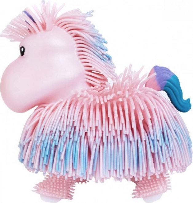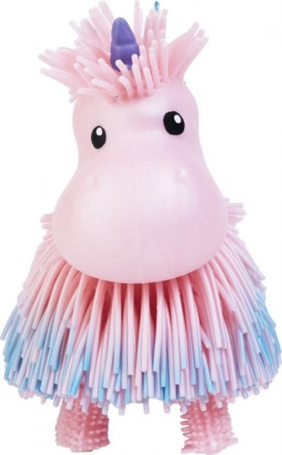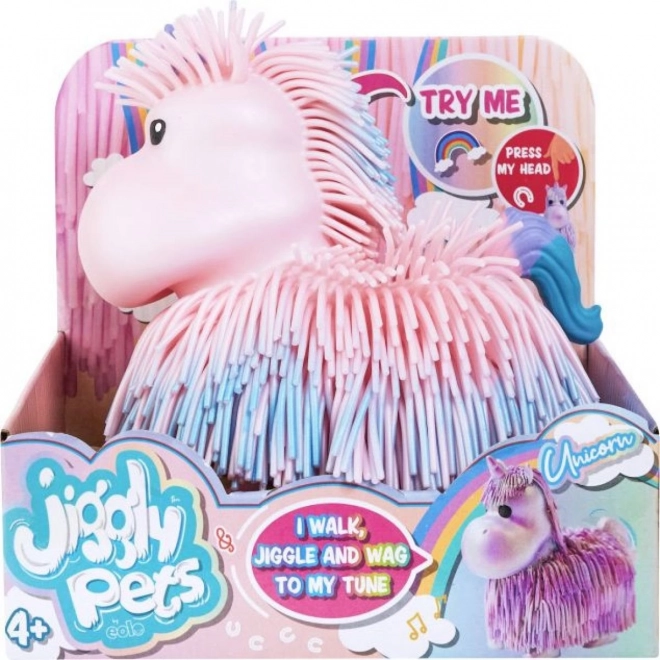 Uroczy interaktywny jednorożec Jiggly Pets, który po naciśnięciu przycisku na głowie ożywa: chodzi, kiwa głową, porusza ciałem i ogonem oraz odtwarza wesołe melodie. Miękka, frędzelkowa powierzchnia zachęca do dotyku, a baterie są dołączone do opakowania (do trybu testowego).