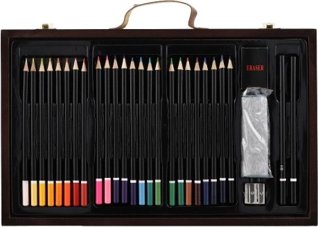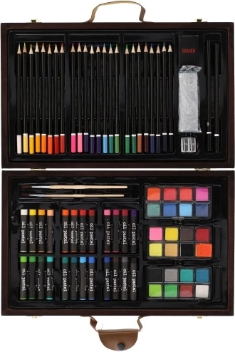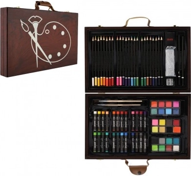 Zawiera kredki, pastele, ołówki grafitowe, farby wodne, pędzle, temperówkę i gumkę - łącznie 79 elementów podstawowych przyborów artystycznych.