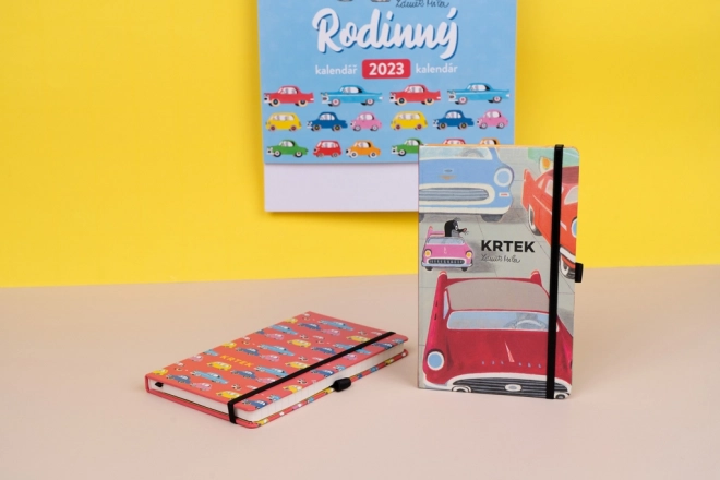 Elegancki notes w linie z motywem Krtek i autko w twardej oprawie jest idealny do codziennych zapisków, dziennika i notatek służbowych. Oferuje praktyczne zapięcie na gumkę, pętelkę na długopis oraz wewnętrzną kieszonkę na drobiazgi. W środku znajdziesz 172 kropkowane strony na żółtym papierze dla przejrzystego i kreatywnego pisania.