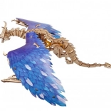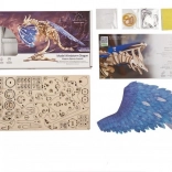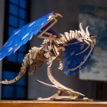 Laserowo wycinane elementy ze sklejki idealnie do siebie pasują, tworząc realistyczny model smoka z wyrazistymi niebieskimi skrzydłami, gotowego zachwycić zarówno na stojaku, jak i w ruchu.