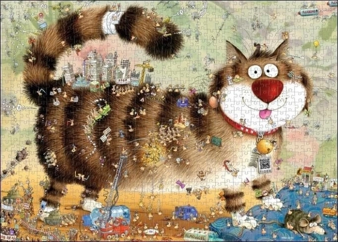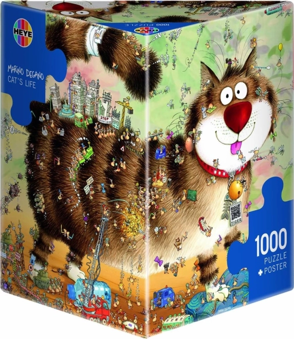 Heye puzzle Kocie życie 1000 elementów z humorystycznym motywem Marino Degano. Trójboczne pudełko, plakat jako wzór, wymiary po ułożeniu 70 × 50 cm.