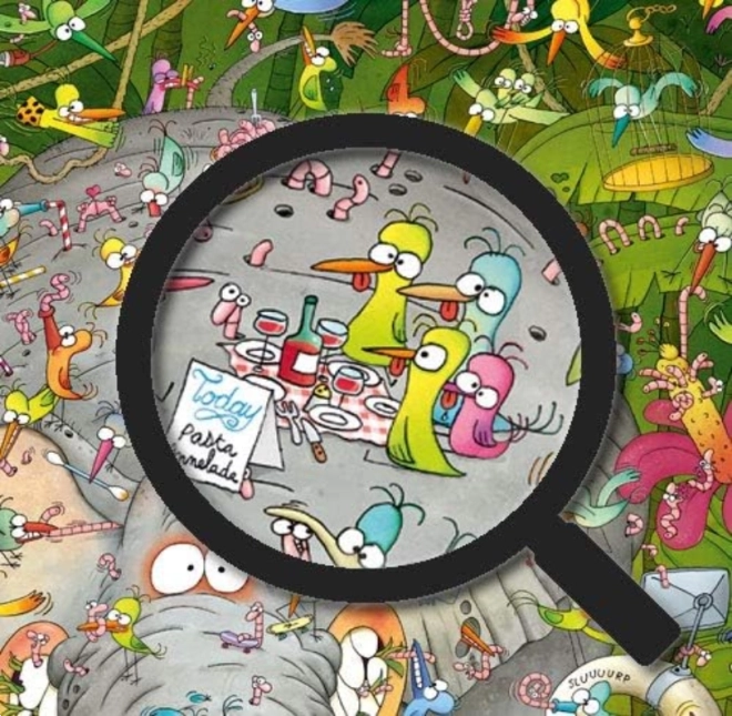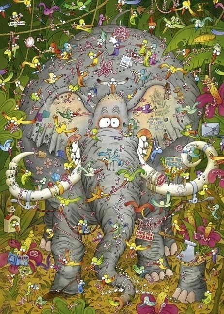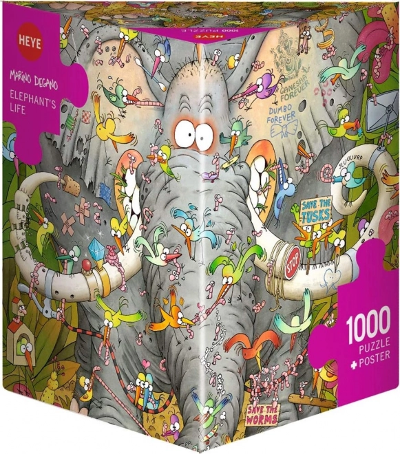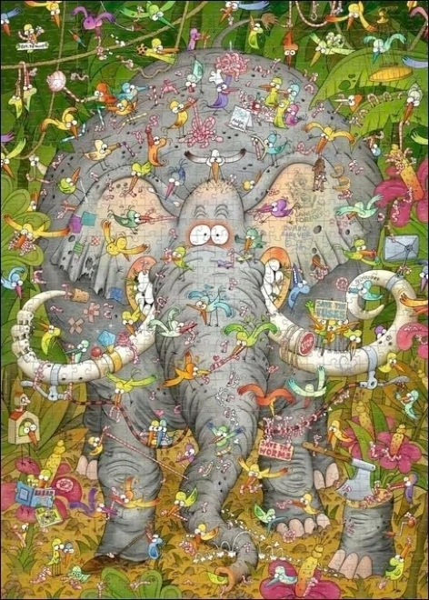 Rozkoszuj się kreatywnym relaksem z puzzlami Heye Słoniowe życie 1000 elementów. Popularny autor Marino Degano tchnął w motyw figlarny humor i mnóstwo drobnych detali, które będą bawić przy każdym kolejnym spojrzeniu. Dzięki dołączonemu plakatowi układanie jest czytelne i wygodne.