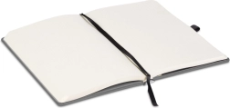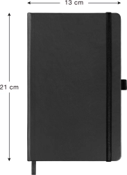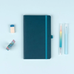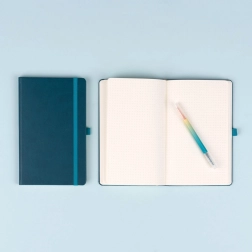 Praktyczny i lekki notes w kropki w modnym turkusowym kolorze ma powierzchnię o delikatnej fakturze, na której można wytłoczyć logo firmy. Notes ma twardą oprawę księgową i zaokrąglone rogi, uchwyt na długopis, elastyczną gumkę oraz materiałową zakładkę. Kropki mają 5 mm i są naniesione na wysokiej jakości żółtym papierze.