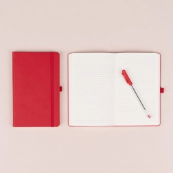 Elegancki liniowany notes w klasycznym czerwonym kolorze oferuje twardą oprawę książkową, elastyczną gumkę, uchwyt na długopis oraz materiałową zakładkę. Powierzchnia o grubszej fakturze jest idealna do tłoczenia logo, a linie 6 mm na wysokiej jakości żółtym papierze zapewniają wygodne pisanie w domu, w biurze i w podróży.