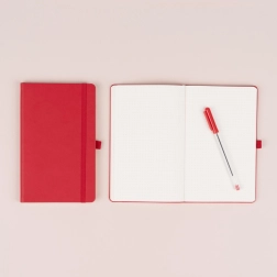 Elegancki notes w kropki w czerwonym kolorze z twardą oprawą i praktycznymi dodatkami jest idealny do planowania, szkicowania i bullet journal. Oferuje żółty papier w kropki 5 mm, pętelkę na długopis, elastyczną gumkę oraz materiałową zakładkę. Powierzchnia o grubszym wykończeniu umożliwia tłoczenie logo, dzięki czemu świetnie sprawdzi się także jako firmowy upominek.