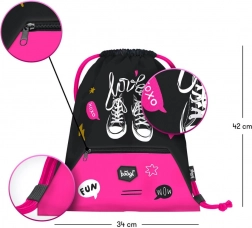 Czarno-różowe połączenie kolorów z zabawnymi motywami, takimi jak trampki, oraz napisami „love” i „xoxo” czyni z tego worka modny dodatek.