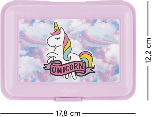 To stylowe pudełko śniadaniowe z motywem UNICORN zostało zaprojektowane do codziennego użytku. Dzięki solidnemu tworzywu i bezpiecznemu zatrzaskowi utrzyma przekąski świeże i pewnie zamknięte w plecaku lub tornistrze.
