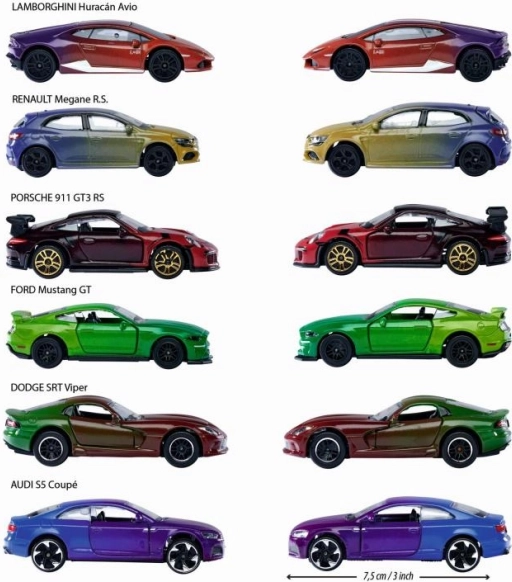 Wybierz spośród modeli PORSCHE 911 GT3 RS, LAMBORGHINI HURACÁN, AUDI S5 COUPÉ, FORD MUSTANG GT, DODGE SRT VIPER i RENAULT MEGANE R.S. – każdy w atrakcyjnych odcieniach i z efektem Color Changers.