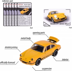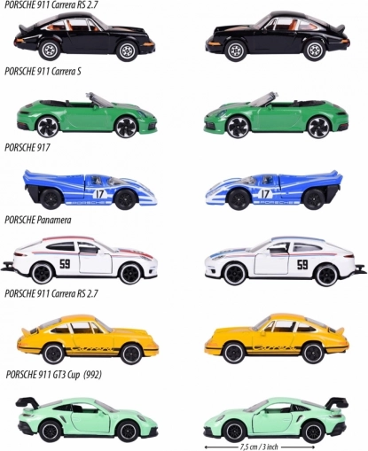 W edycji znajdziesz miks sześciu legendarnych pojazdów: Porsche 911 Carrera S (zielony), Porsche 917 (niebieski), Porsche 911 Carrera RS 2.7 (czarny i żółty), Porsche 911 GT3 Cup (992) (turkusowy) oraz Porsche Panamera (biały). Zawartość opakowania jest losowa – nie ma możliwości wyboru konkretnego modelu. Każde autko ma około 7,5 cm długości i jest uzupełnione o kartę kolekcjonerską z informacjami, takimi jak prędkość czy liczba cylindrów.