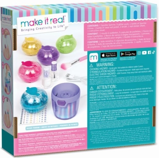 Zestaw zawiera pięć rodzajów brokatu, spinner do mieszania, lakier bazowy, lakier bezbarwny, pędzelek i naklejki, które umożliwiają osobisty design paznokci.