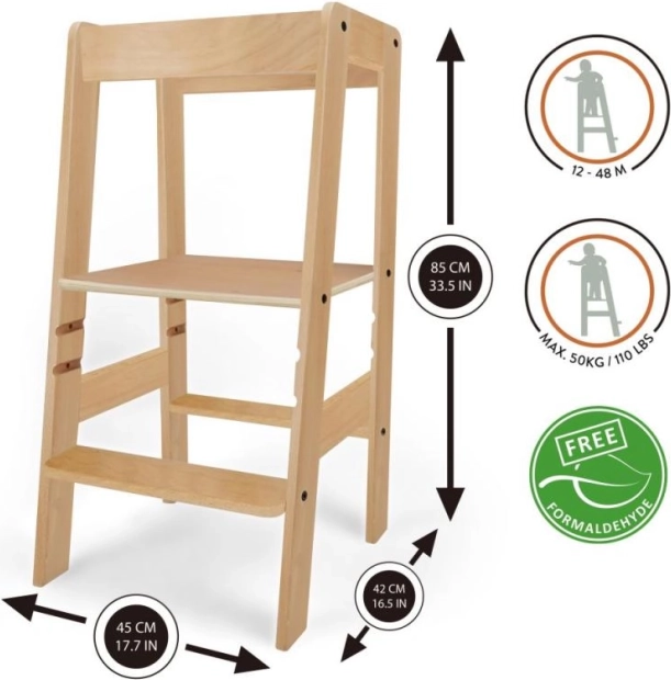 Wieża została zaprojektowana tak, aby dzieci mogły samodzielnie wspiąć się na platformę przy minimalnym wysiłku, co wspiera ich niezależność i umiejętności motoryczne. Wykonana z testowanego drewna bez formaldehydu, co gwarantuje bezpieczeństwo materiału dla Twojego dziecka.