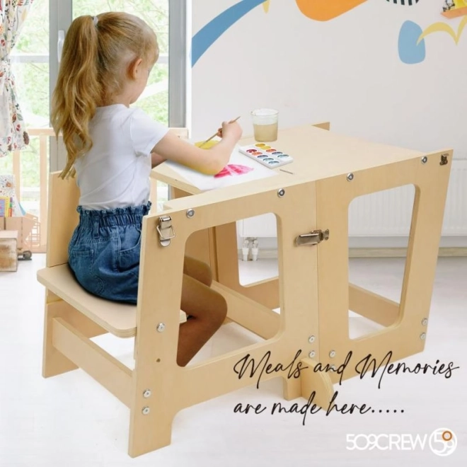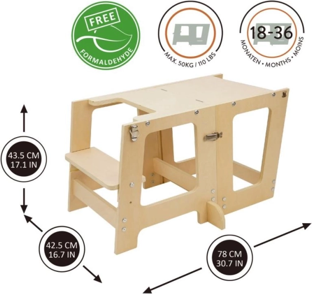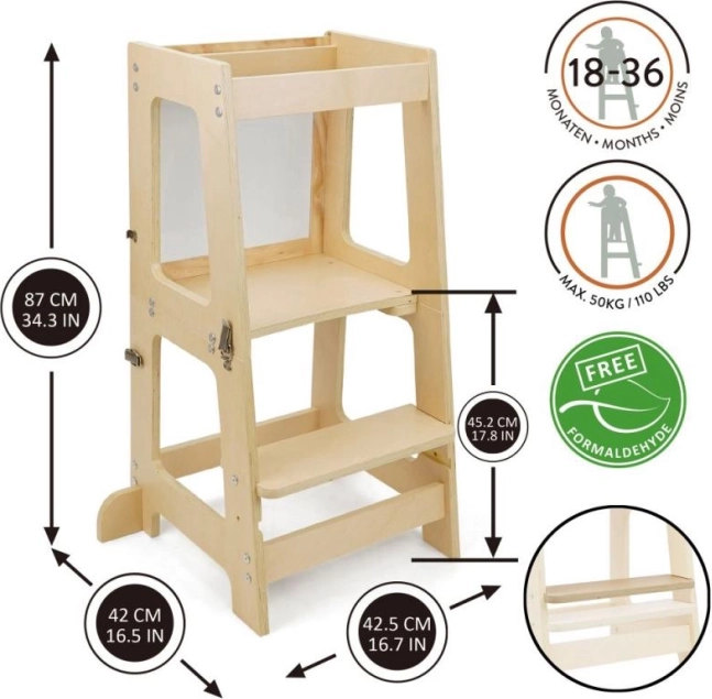 Wieża edukacyjna Prema 3w1 jest wykonana z wysokiej jakości i trwałej sklejki, która umożliwia łatwy montaż i długą żywotność. Posiada 2 poziomy wysokości (16,5 cm i 22,5 cm), aby łatwo dostosować się do wzrostu twojego dziecka.