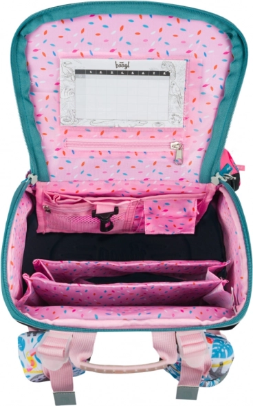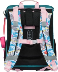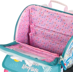 • Wewnątrz tornistra znajduje się przezroczysta kieszeń z planem lekcji oraz wewnętrzny organizer umożliwiający równomierne rozłożenie ciężaru, uzupełniony gumką do mocowania.