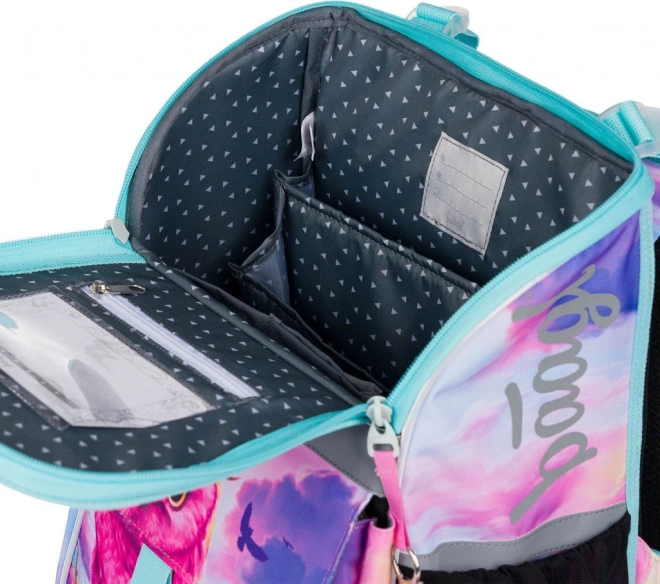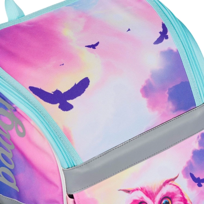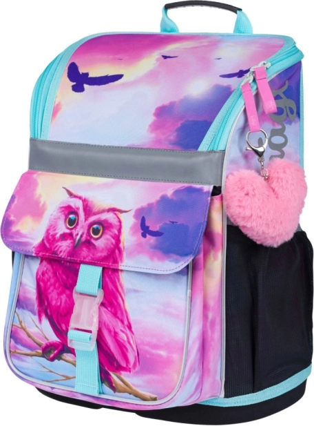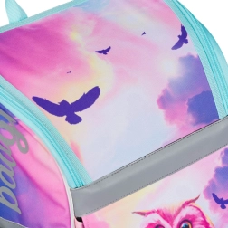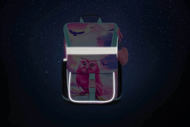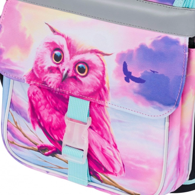 Tornister z unikalnym wzorem sowy przyciąga uwagę i dodaje zabawnego akcentu szkolnemu wyposażeniu.