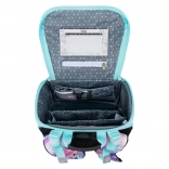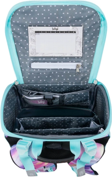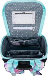 Tornister wyróżnia się nowym odchylanym systemem otwierania, który ułatwia dostęp do przyborów bezpośrednio z ławki. Wewnątrz znajduje się przezroczysta kieszeń z planem lekcji, wewnętrzny organizer z gumką oraz boczne kieszenie z wytrzymałej siatki, odpowiednie na butelkę z napojem.