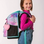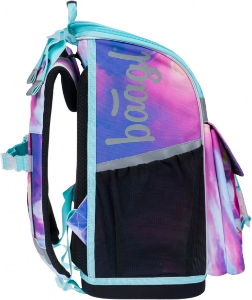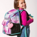 Tornister posiada boczne siatkowe kieszenie na napój oraz elementy odblaskowe zwiększające bezpieczeństwo dziecka w drodze do szkoły.