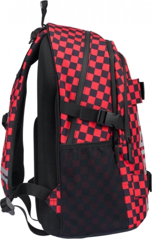 Trzy komory z organizerem, wyściełane plecy oraz w pełni regulowane szelki, pas piersiowy i paski kompresyjne. Przednie paski bezpiecznie utrzymają deskorolkę, boczne siatkowe kieszenie pomieszczą butelkę.