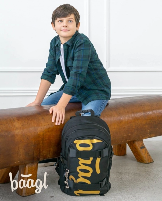 Stylowy szkolny zestaw BAAGL SKATE GOLD zawiera ergonomiczny plecak, pojemny piórnik i praktyczny worek. Plecak oferuje 3 komory, kieszeń na laptop 15", paski do mocowania deskorolki oraz elementy odblaskowe. Niska waga 850 g, pojemność 25 l i wodoodporny materiał gwarantują wygodę i trwałość na każdy szkolny dzień.