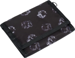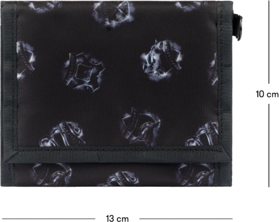 Czarny wzór z motywami Hogwartu nadaje portfelowi unikalny wygląd.