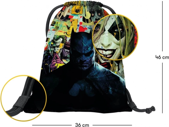Woreczek zdobi fascynująca grafika z wyrazistą ilustracją Batmana oraz barwnymi postaciami i symbolami.