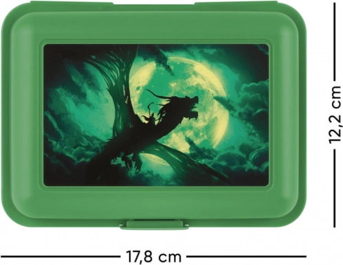To praktyczne pudełko na drugie śniadanie jest idealnym rozwiązaniem do codziennego przechowywania twoich ulubionych potraw. Ze stylowym designem smoka lecącego na tle pełni księżyca, nie tylko utrzymuje świeżość twojego jedzenia, ale także przyciąga oryginalnym wyglądem. Łatwe zamknięcie na jeden zamek i wewnętrzna przegroda dzieląca oznaczają, że każda część jedzenia pozostanie na swoim miejscu.