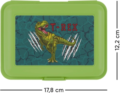 Stylowe pudełko na drugie śniadanie z motywem T-Rex jest idealne dla małych i dużych odkrywców. To zielone plastikowe pudełko jest wyposażone w zamknięcie na jeden zatrzask oraz przegrodę dzielącą do łatwego uporządkowania jedzenia. Łatwe do przenoszenia i idealne do codziennego użytku.