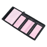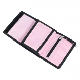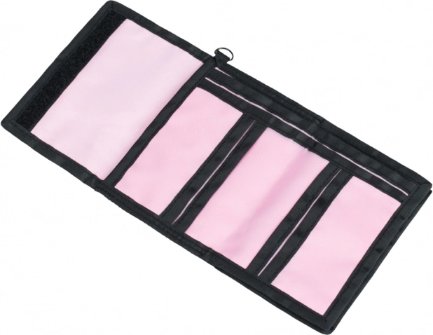 Posiada kilka przegródek, w tym przezroczystą kieszonkę na karty oraz kieszeń na zamek na gotówkę.