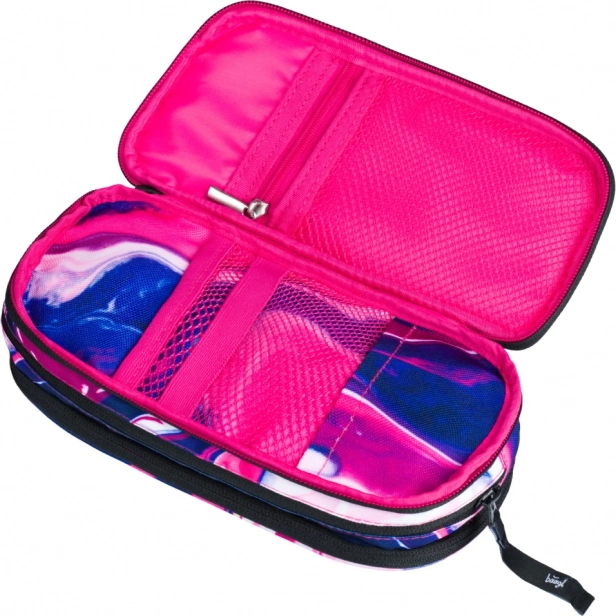 Przejrzyste wnętrze z elastycznymi uchwytami i siateczką ułatwia organizację przyborów do pisania.