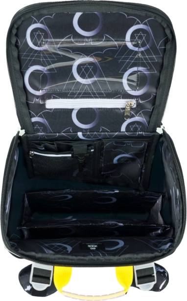 Praktyczne odchylane otwieranie zapewnia dostęp do zawartości aktówki prosto z ławki. Wewnątrz znajdziesz przezroczystą kieszeń na plan lekcji oraz organizer z gumką mocującą dla przejrzystego ułożenia podręczników i zeszytów. Izolowana przednia kieszeń z klamrą chroni śniadanie, boczne siatkowe kieszenie mieszczą butelkę na napój. Wytrzymałe wodoodporne materiały, stabilne dno i elementy odblaskowe zwiększają odporność i bezpieczeństwo w drodze do szkoły.