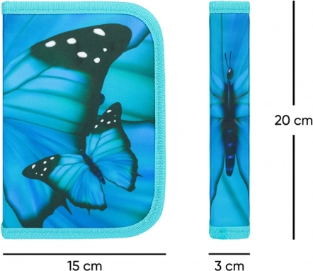 Turkusowy design z wyrazistym motylem nadaje przyborom szkolnym niepowtarzalny wygląd i spodoba się młodszym oraz starszym uczniom.