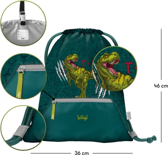 Stylowy i funkcjonalny worek BAAGL T‑Rex jest idealny do przenoszenia kapci, stroju sportowego oraz drobiazgów na zajęcia. Dzięki wytrzymałemu, łatwo zmywalnemu materiałowi wytrzyma codzienne użytkowanie i utrzyma zawartość w bezpieczeństwie i suchości.
