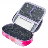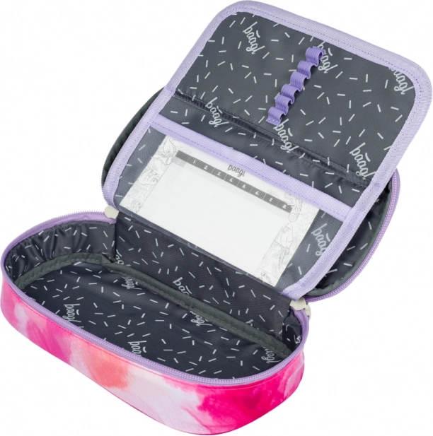 Piórnik oferuje rozkładaną wewnętrzną przegrodę, kieszeń na zamek błyskawiczny i miejsce na plan lekcji, co ułatwia organizację wszystkich potrzebnych rzeczy.