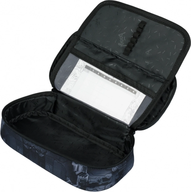 Piórnik zawiera odchylaną przegrodę oraz wewnętrzną kieszeń na zamek, idealny do przechowywania artykułów piśmienniczych i innych przyborów szkolnych.