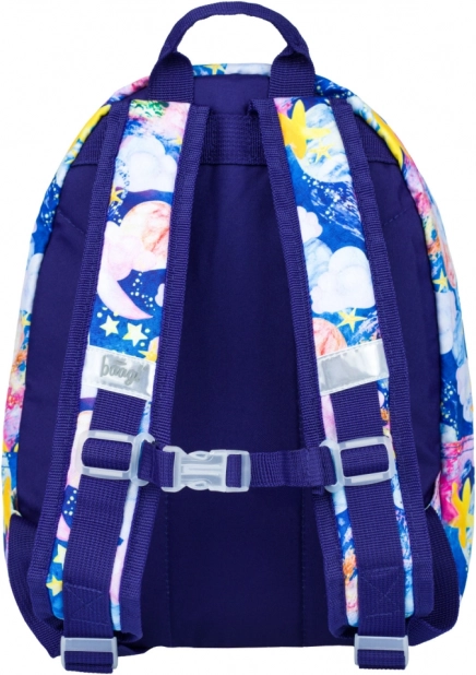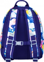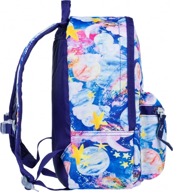 Kolorowe gwiazdy, planety i chmury na niebieskim tle zachwycą każde dziecko i nadadzą plecakowi oryginalny wygląd, który wyróżni się w przedszkolu i na wycieczkach.