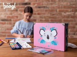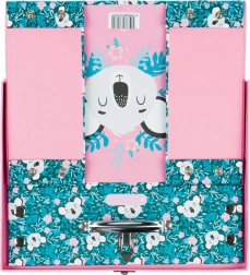Składany szkolny kufer z delikatnym motywem koali jest idealny na przybory plastyczne, zeszyty, zabawki oraz drobiazgi w podróż. Eleganckie metalowe elementy i okute rogi zapewniają długą żywotność, a lekka konstrukcja z wytrzymałego laminowanego papieru ułatwia codzienne przenoszenie.
