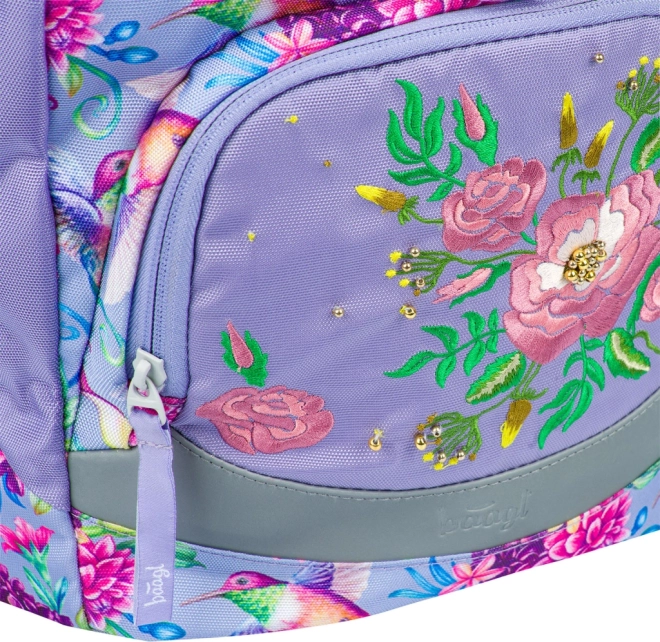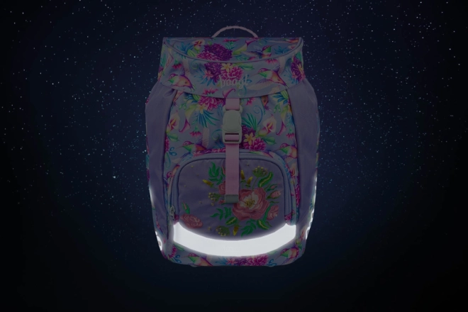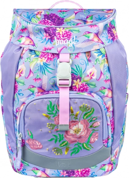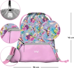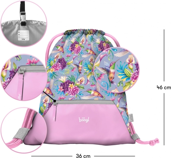 - Design: radosny motyw koliberków i kwiatów, spójny plecak, piórnik i worek.